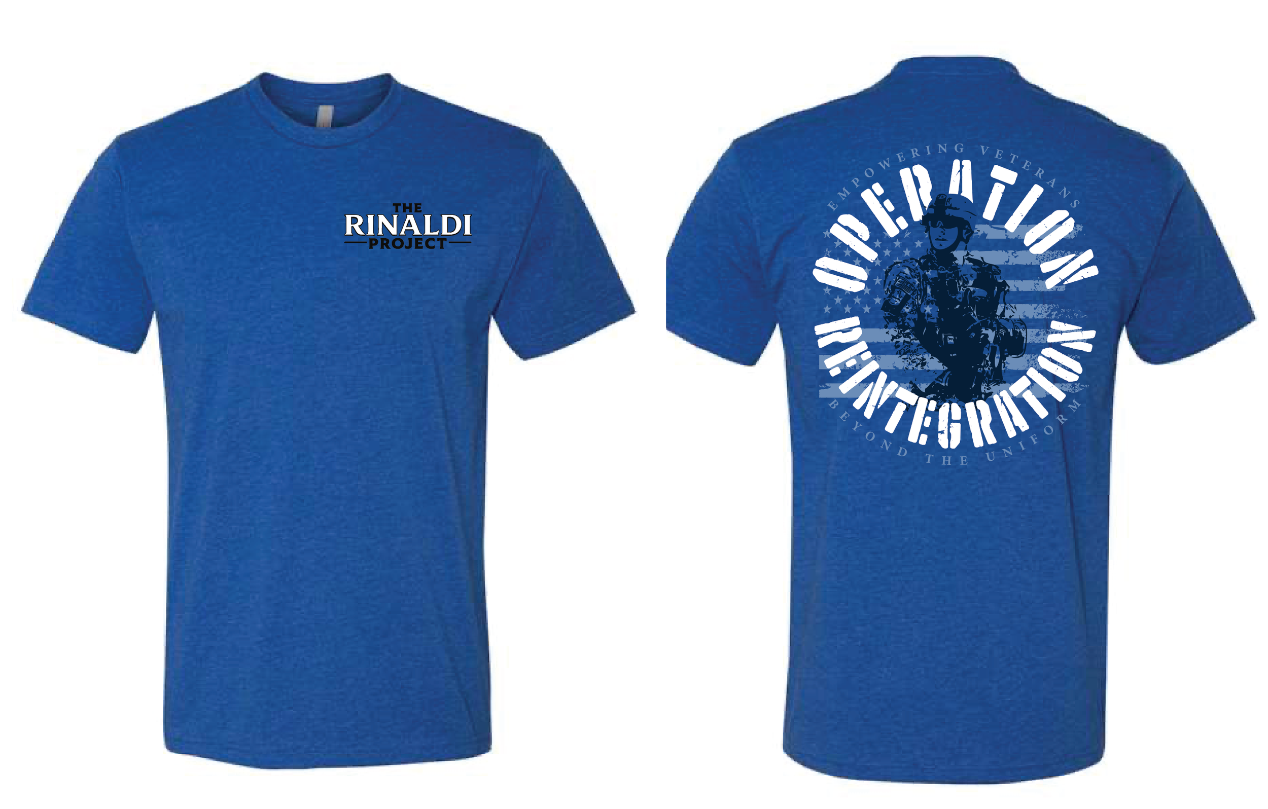 Featuring a powerful full-back design of a combat-ready veteran overlaid on the American flag, and front-chest “The Rinaldi Project” branding, this tee honors the reintegration journey—from the battlefield to the home front.